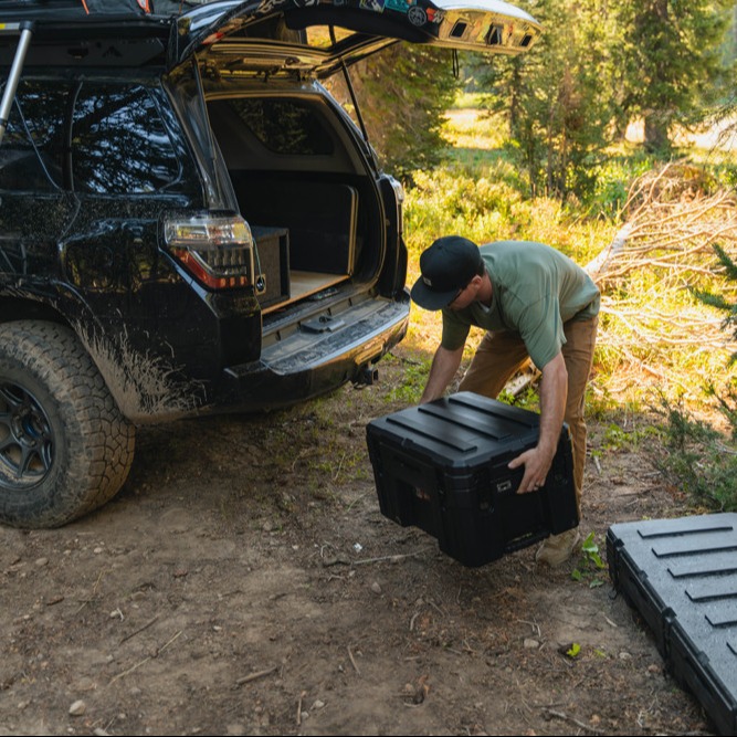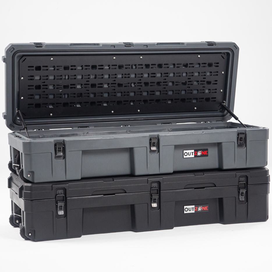 The OUTZONE 128L Rugged Case is a heavy-duty storage case that comes in 3 popular colors options & customized color and is ideal for storing your tools and dry goods that need to be packed in tight spaces. Perfect for the back seat of your car or the bed of your truck. This premium case features a durable LLDPE shell, Nylon rope handles, steel lockable latches, and a dust/water resistant gasket seal that makes sure your gear always stays protected no matter the weather or terrain. The threaded inserts in the lid give you the ability to add a lid organizer or molle panel to take your organization to the next level. Having an interlocking design makes stacking and pairing simple no matter the amount of gear you carry.