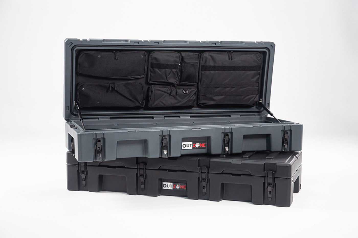 The OUTZONE 116L Rugged Case is a heavy-duty storage case that comes in 3 popular colors options & customized color and is ideal for storing your long items such as chairs, shovels, axles, recovery gear or just adding more storage to any vehicle. Rugged storage that seamlessly mounts the roof of any vehicle. This premium case features a durable LLDPE shell, our proprietary Lid-Lifts, Nylon rope handles, steel lockable latches, and a dust/water resistant gasket seal that makes sure your gear always stays protected no matter the weather or terrain. The threaded inserts in the lid give you the ability to add a lid organizer or molle panel to take your organization to the next level. Having an interlocking design makes stacking and pairing simple no matter the amount of gear you carry..